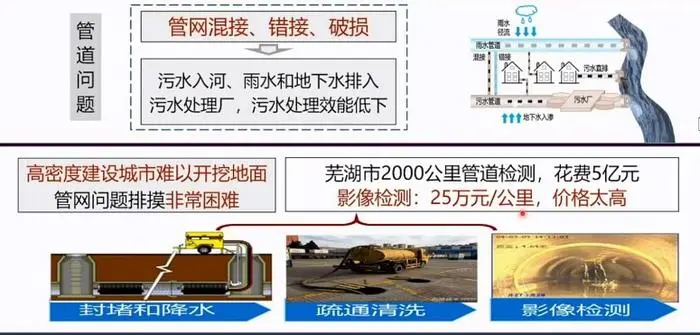 徐祖信表示,一是混接,污水管道接入雨水系統(tǒng),導(dǎo)致污水直接排河;二是污水管道破損現(xiàn)象嚴(yán)重,導(dǎo)致地下水排入污水處理廠;三是錯(cuò)接,雨水管道接入污水系統(tǒng),導(dǎo)致雨水進(jìn)入污水處理廠;四是混流,合流管道和分流管道串接,導(dǎo)致污水管網(wǎng)不成體系。